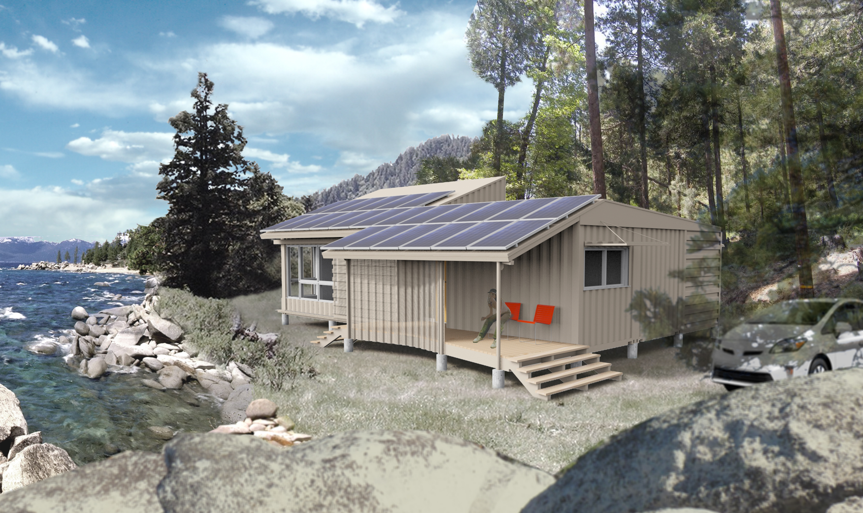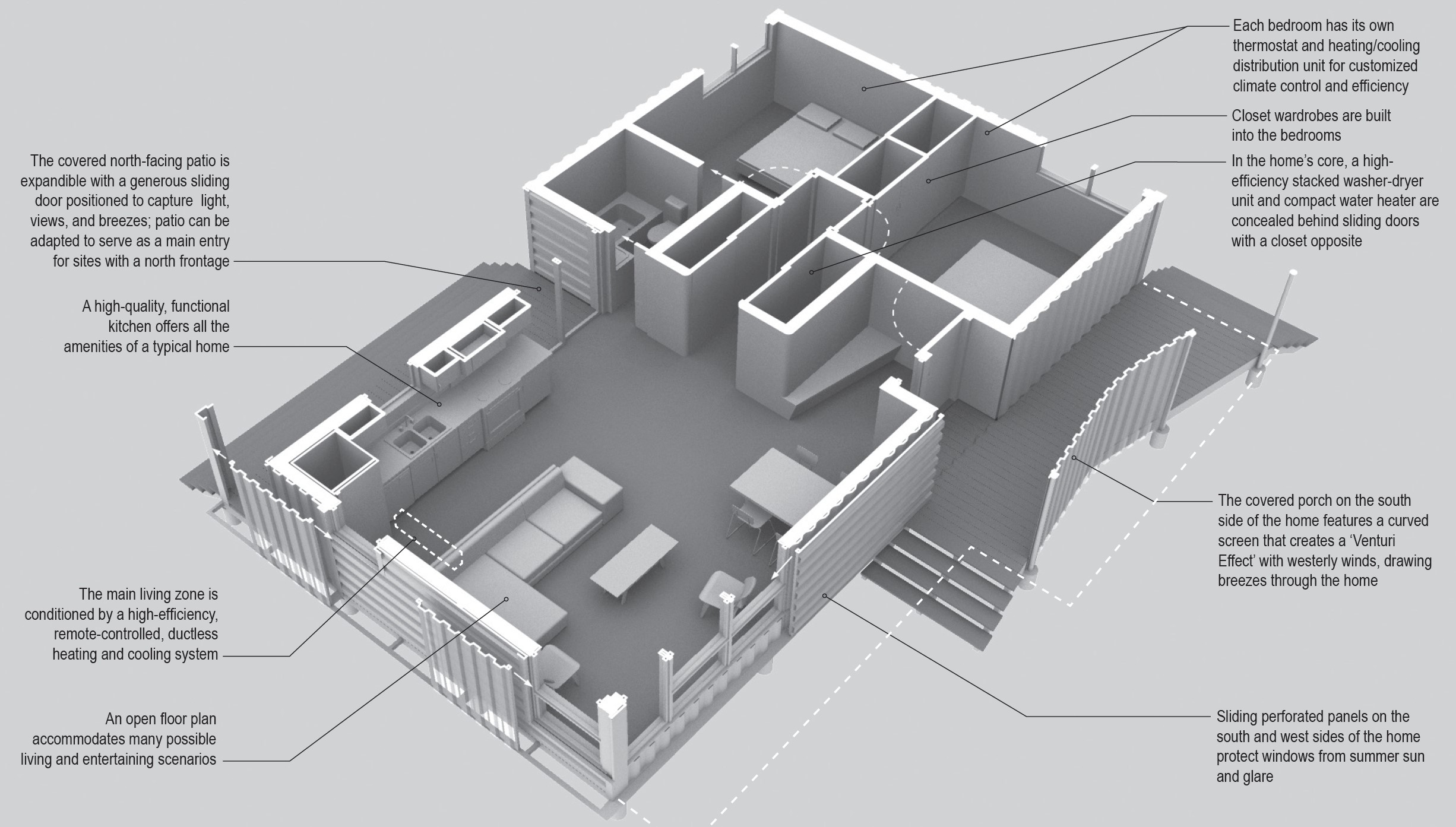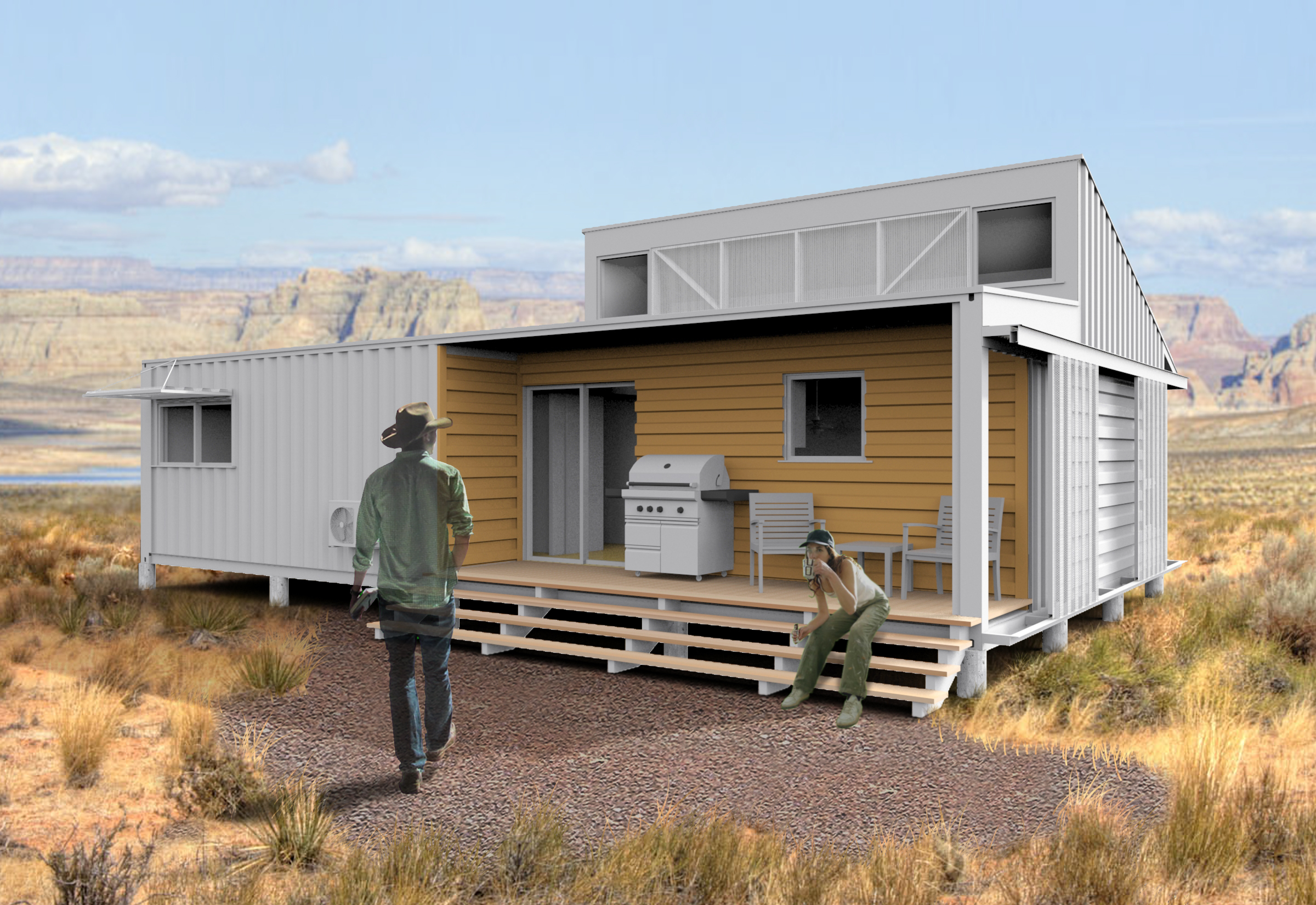 A startup with roots in Kansas and Arizona worked with Helia to develop this prototype for a cabin that would use recycled shipping containers. Unlike many container-based projects, Helia’s solution used a minimal tube steel frame that would stitch two containers together, while reinforcing a large cutaway in the original container shell. The result is flexible open plan that focuses on the main living space, featuring ample daylight, natural ventilation, and solar heating. Helia also developed project-specific solutions for foundations, prefab deployment, and high-density insulation.