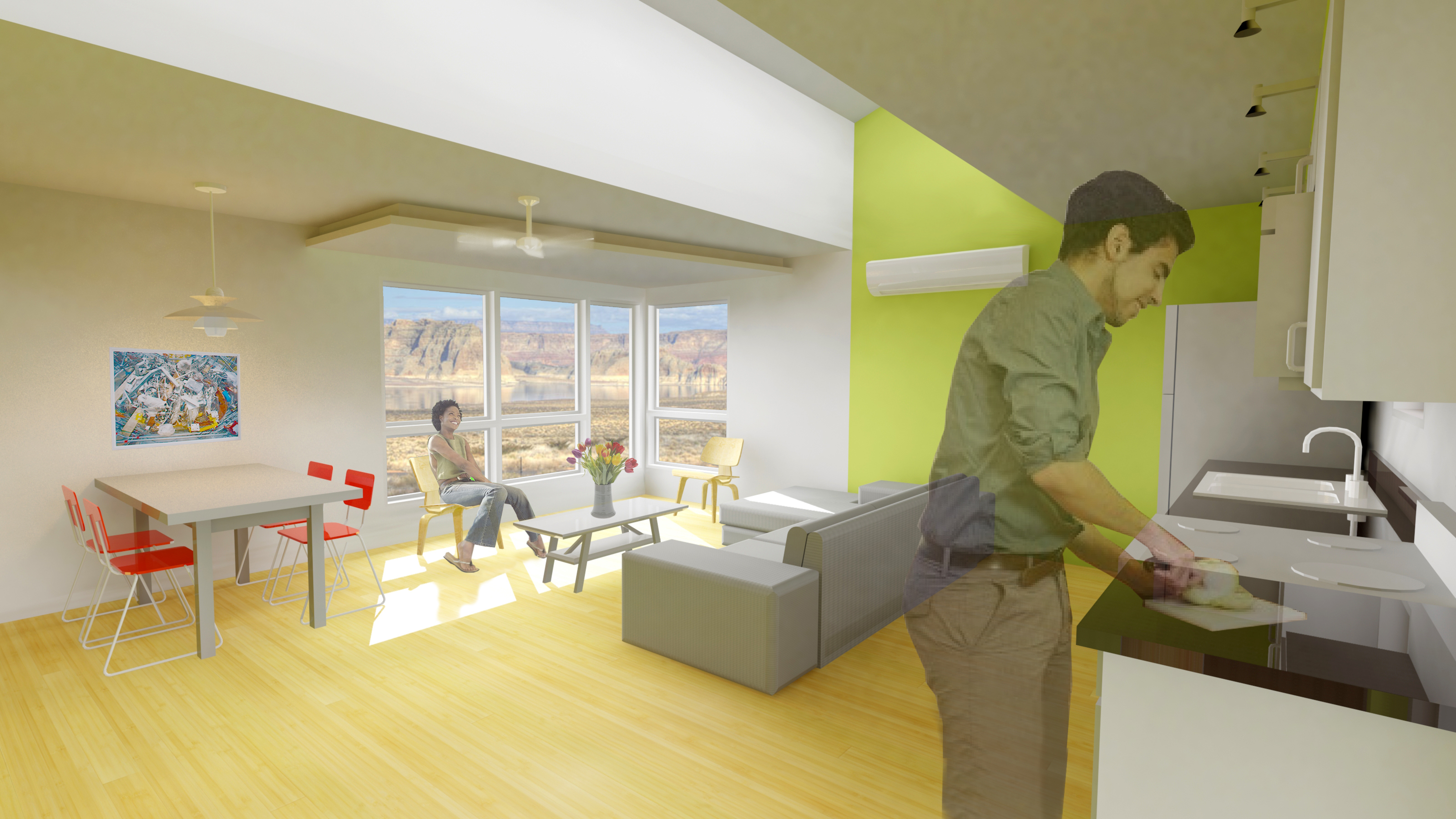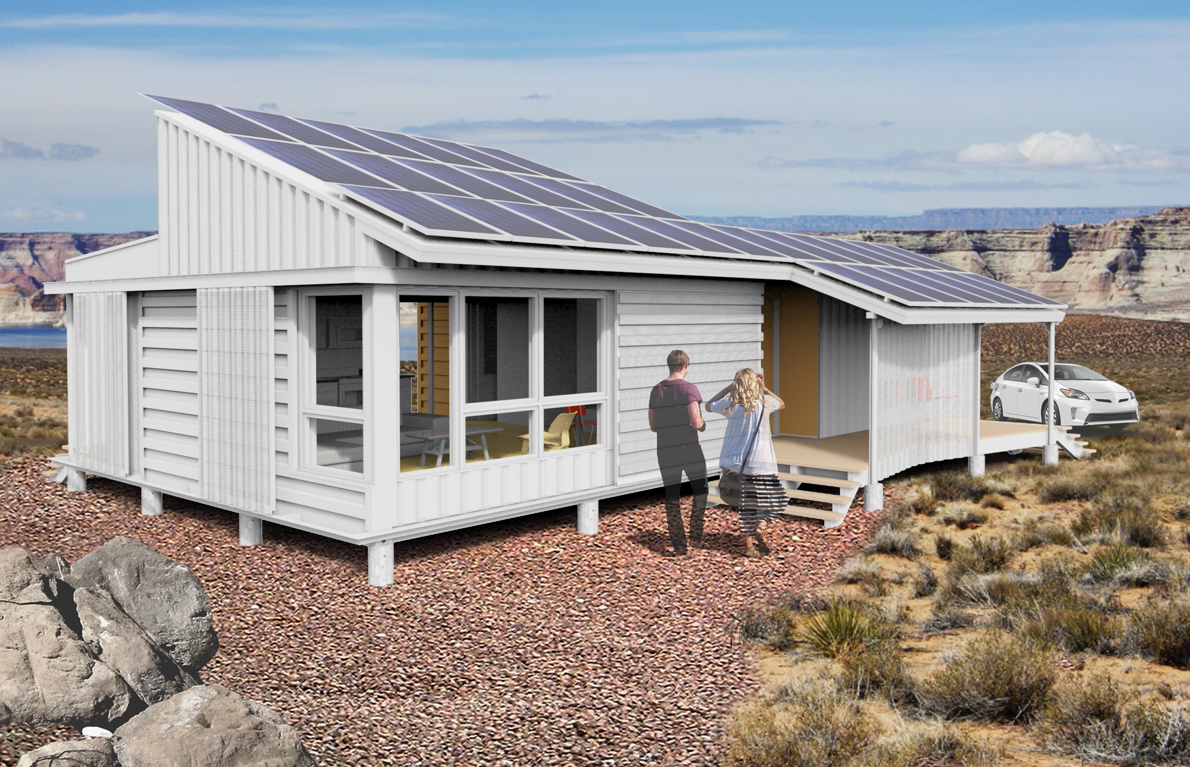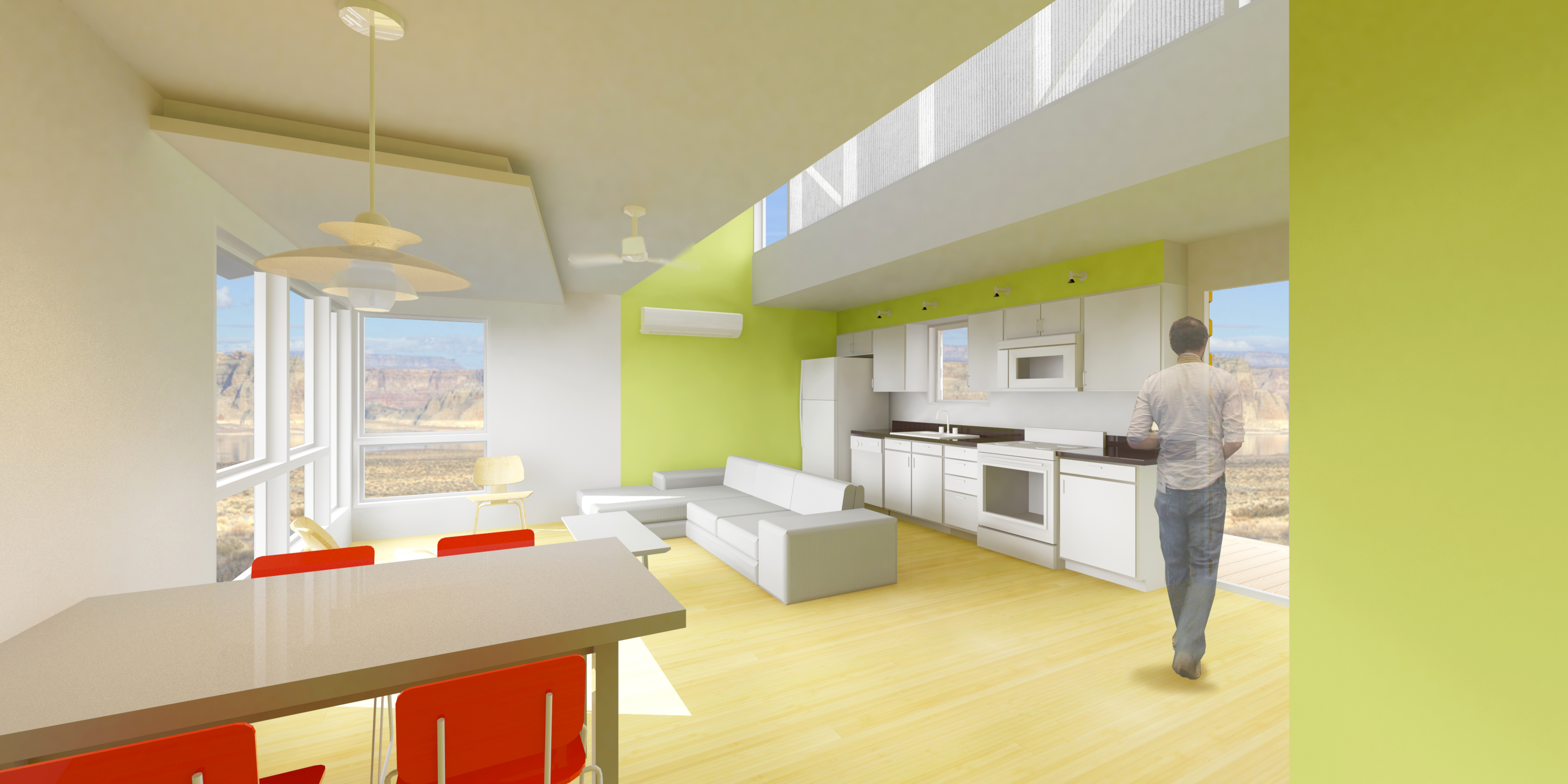 A startup with roots in Kansas and Arizona worked with Helia to develop this prototype for a cabin that would use recycled shipping containers. Unlike many container-based projects, Helia’s solution used a minimal tube steel frame that would stitch two containers together, while reinforcing a large cutaway in the original container shell. The result is flexible open plan that focuses on the main living space, featuring ample daylight, natural ventilation, and solar heating. Helia also developed project-specific solutions for foundations, prefab deployment, and high-density insulation.