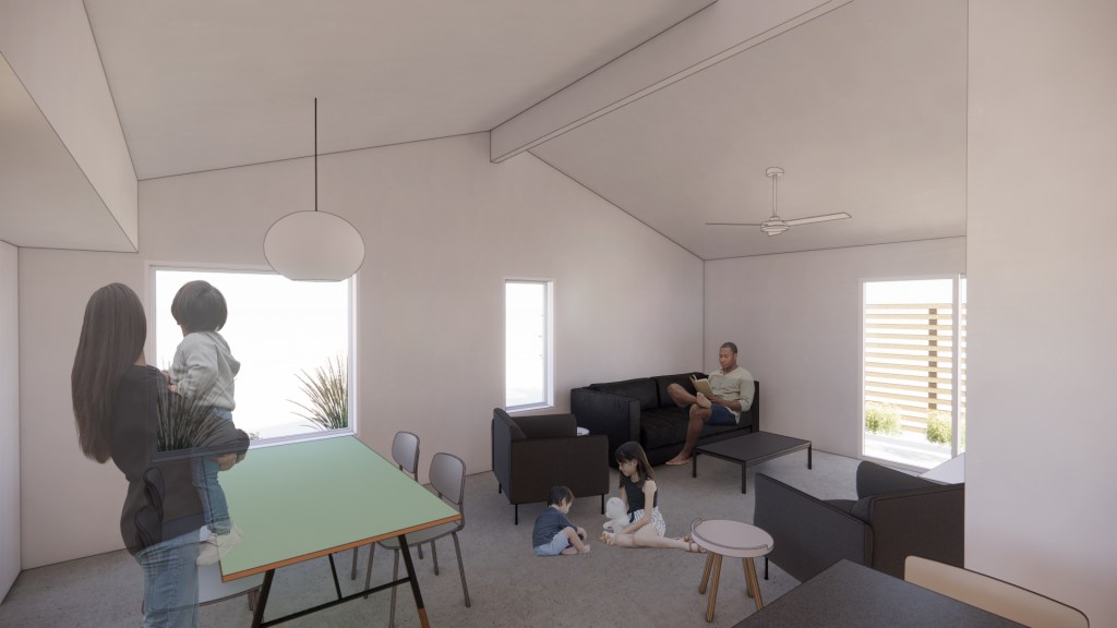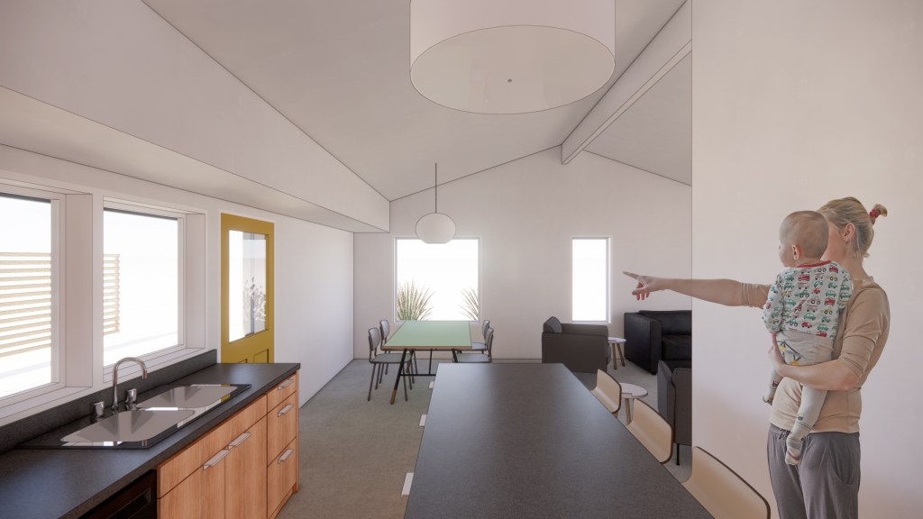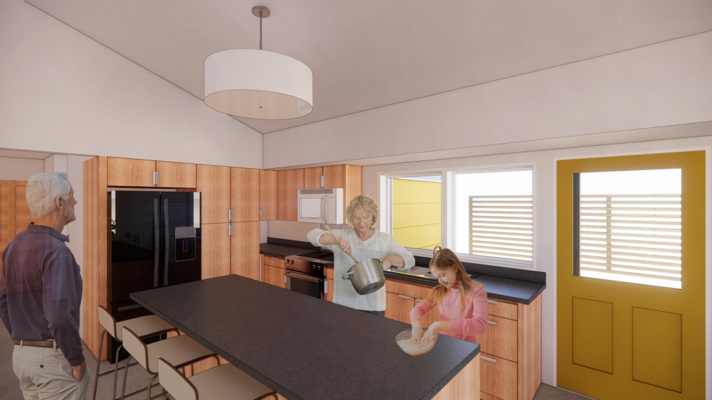 Helia worked with SENT to develop a prototype home that would offer a simple design, affordable price, and net zero performance while fitting into the Hi-Crest neighborhood. Following Helia’s residential design philosophy, the house maximizes daylight, space, and function inside, with modest exterior accentuated by a porch and two-color paint scheme. The kitchen/living/dining room has tall ceilings and big windows that offer the airiness of a larger home, while interlocking with the private spaces beyond in efficient 1197 ft2 footprint.